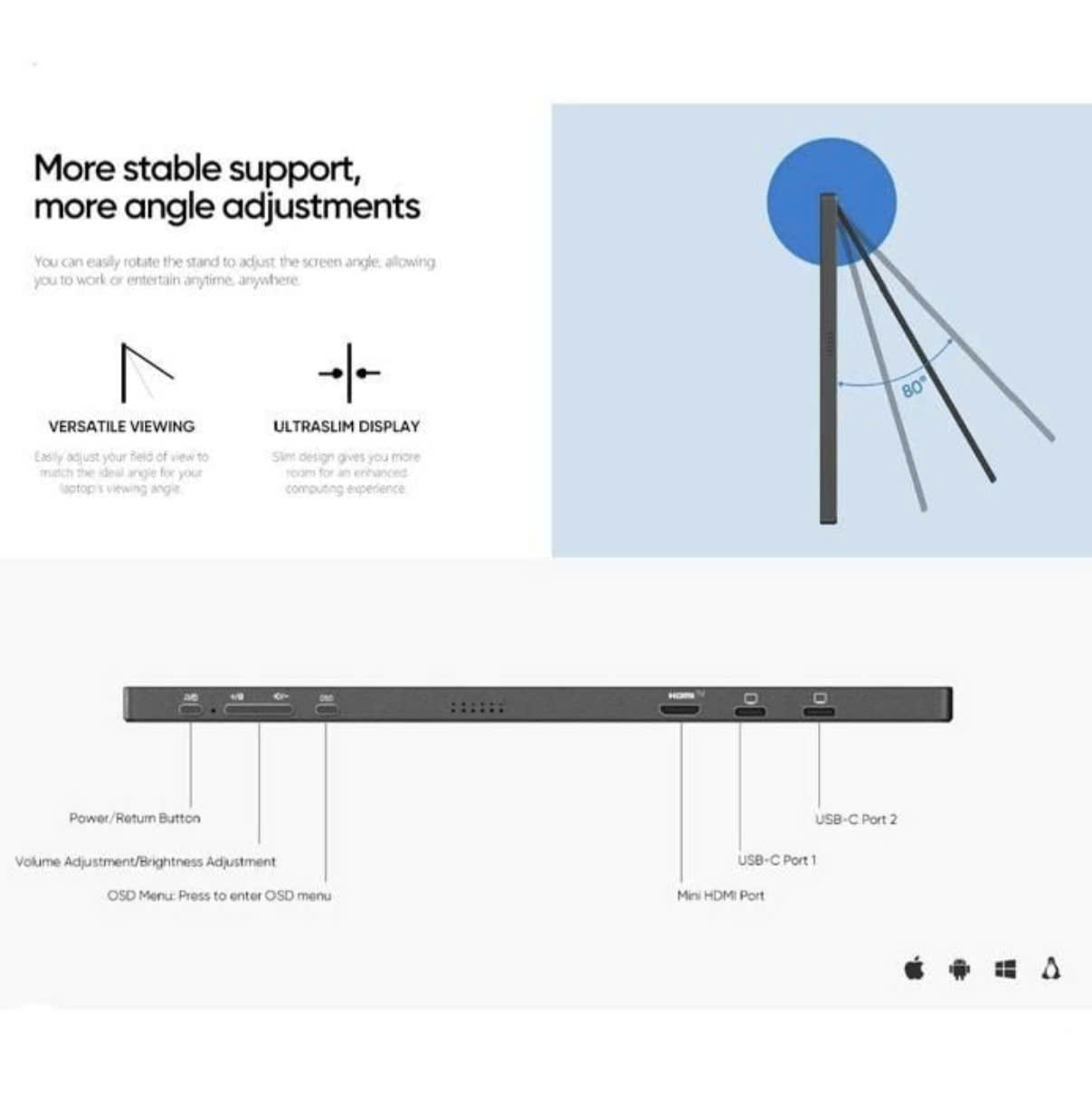 Máy tính xách tay (Với Type-C): Kết nối cáp Type-C đến Type-C từ máy tính xách tay với màn hình. Nếu bạn muốn điều chỉnh độ sáng và âm lượng trên 80%, hãy đảm bảo kết nối nguồn điện bên ngoài từ 5V/3A trở lên.