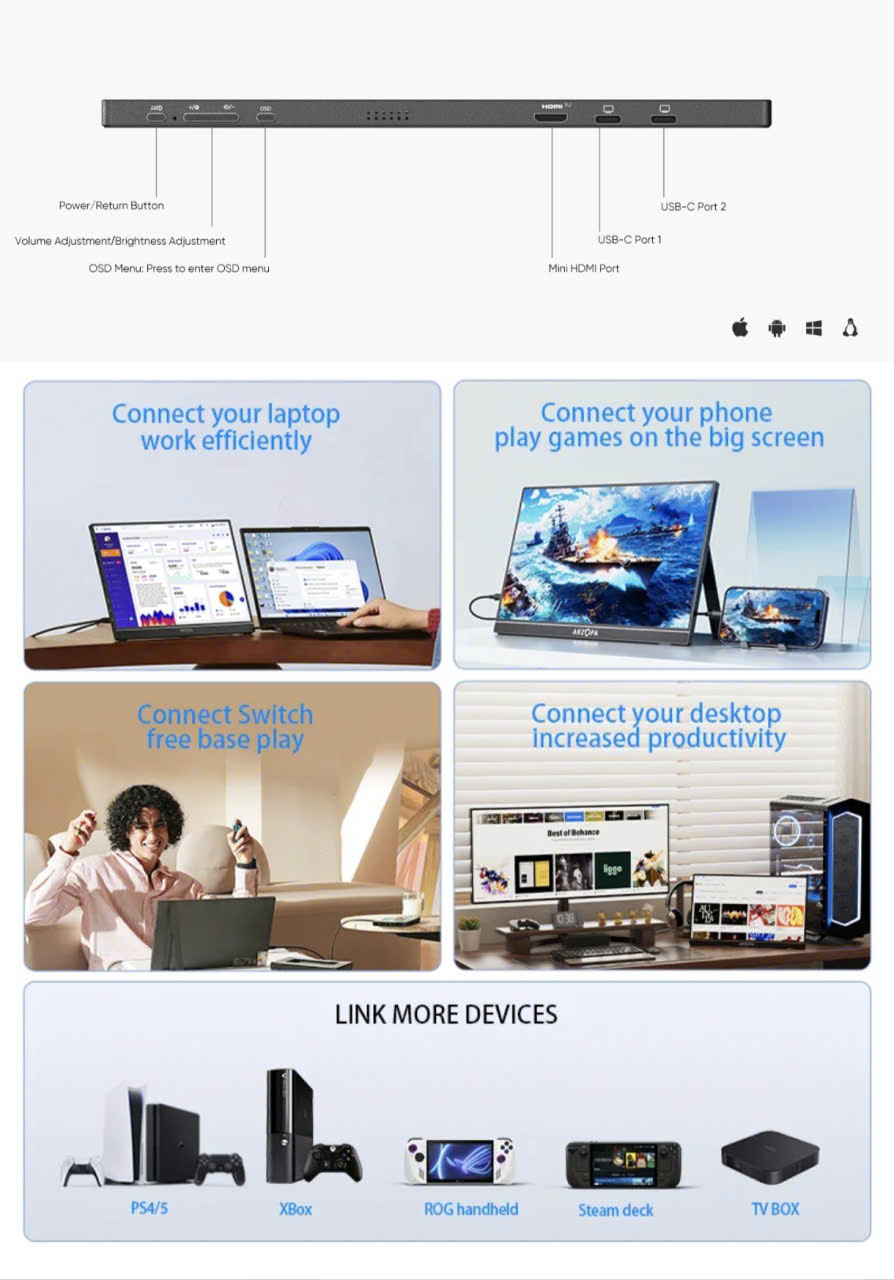 Điện thoại (Với Type-C): Kết nối cáp Type-C đến Type-C từ điện thoại di động với màn hình. Nếu không có nguồn điện bên ngoài, điện thoại di động sẽ cấp nguồn cho màn hình ở chế độ tiết kiệm năng lượng. Khi nguồn điện bên ngoài được kết nối, điện thoại di động sẽ được sạc thông qua nguồn điện bên ngoài. Lưu ý rằng để đảm bảo đủ dòng điện hoạt động, hãy sử dụng ít nhất bộ sạc hoặc sạc dự phòng 15W làm nguồn điện bên ngoài.